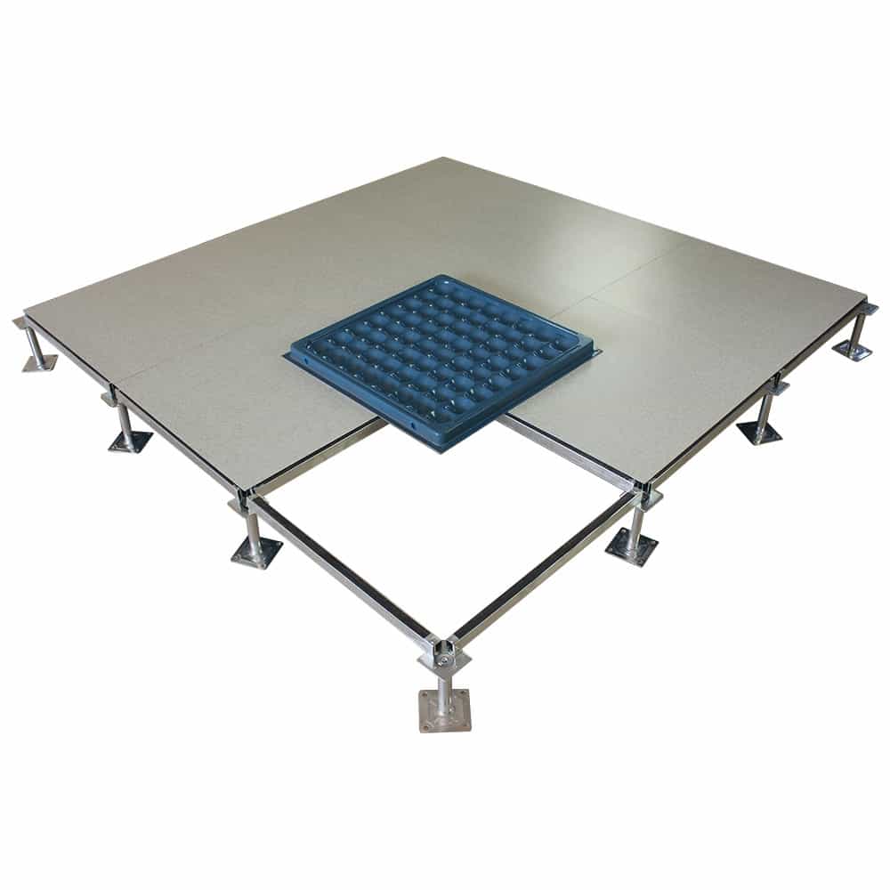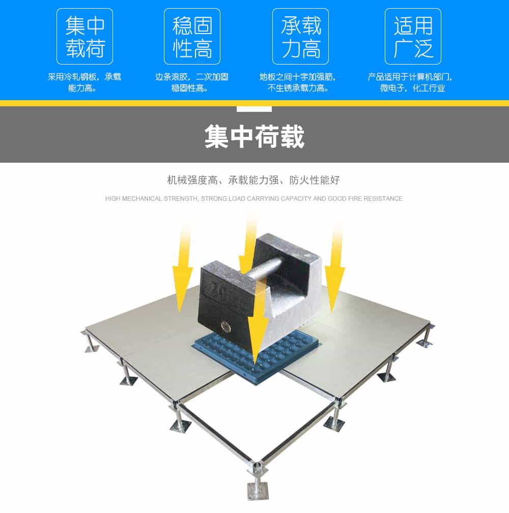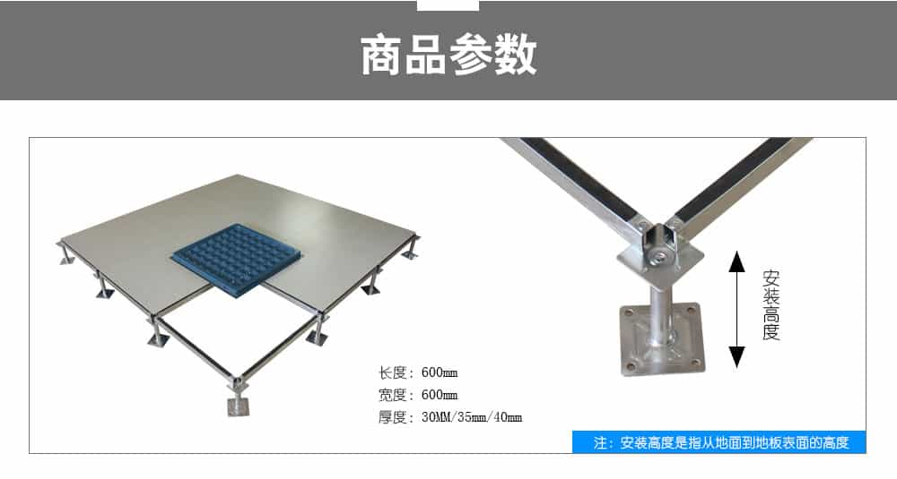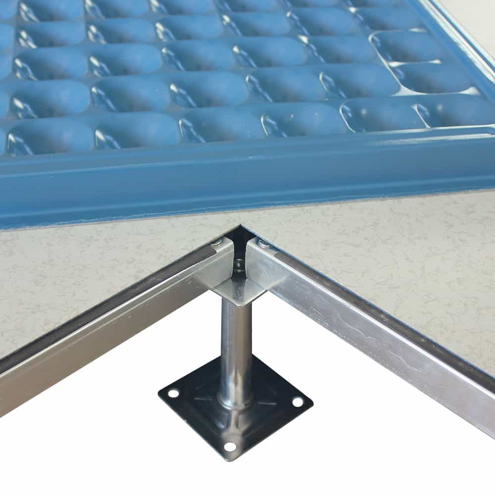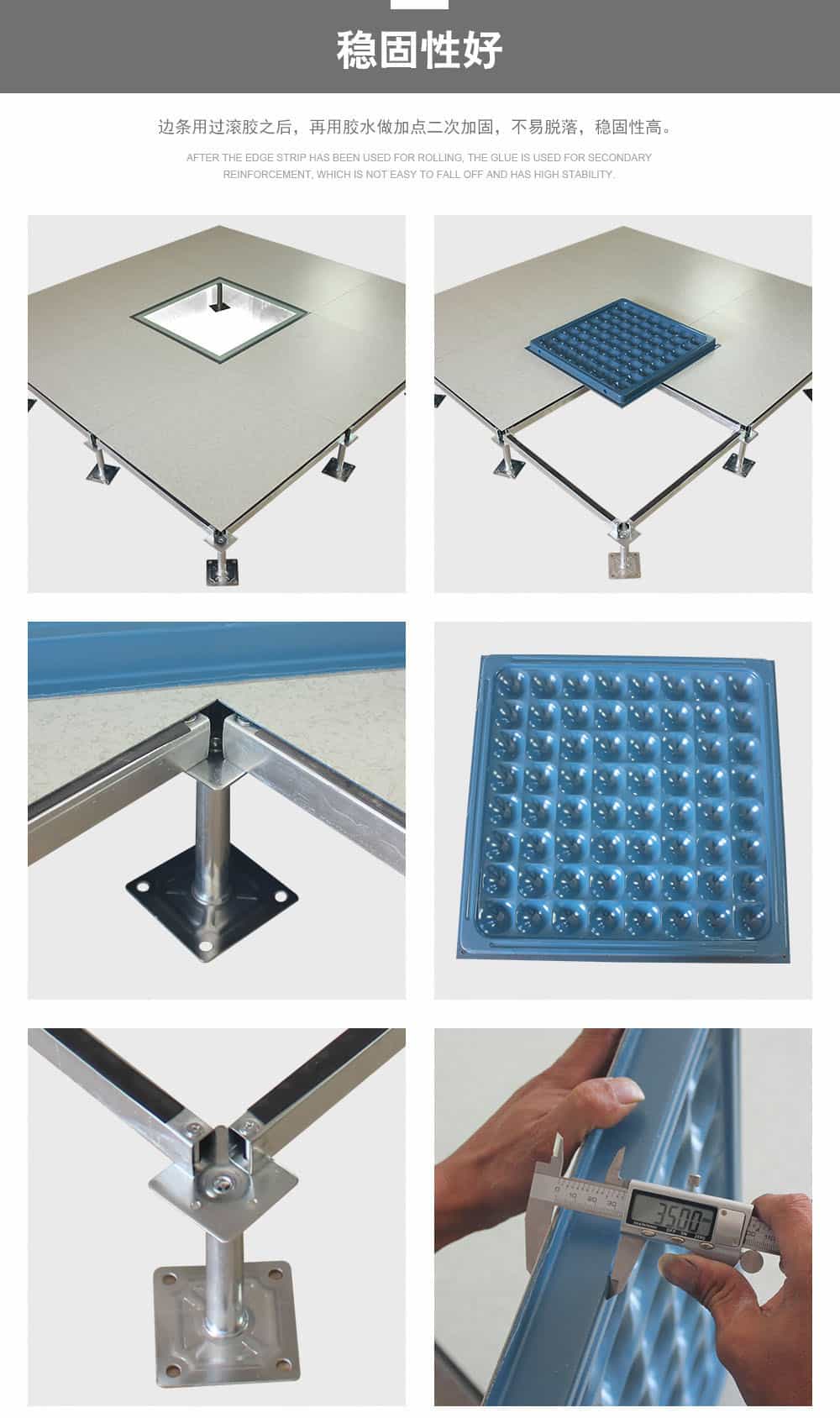 全鋼防靜電地板為全鋼組件,分有邊、無邊、微邊(三種邊處理方式)。底面采用SPCC深沖冷軋板拉伸成型鋼板厚度(0.4~1.5mm),球窩狀結構,增加地板的機械荷載強度。面板采用硬質SPCC鋼板(0.5~2.0mm),上下經過點焊焊接成型,切邊沖孔后,經防銹處理,環氧樹脂粉末靜電噴涂后,中間填充發泡水泥(可以根據客戶需求發泡不同重量),再經過日曬養護后形成穩定的承載結構。地板上表層粘貼防火板(HPL)/復合PVC/ 通體PVC/陶瓷地磚等不同材質的裝飾表層,達到產品花色的多樣性、可以根據客戶需求個性化定制產品。搭配聯網支架、支架、螺釘組裝后,定位聯接更加準確、精度可靠。