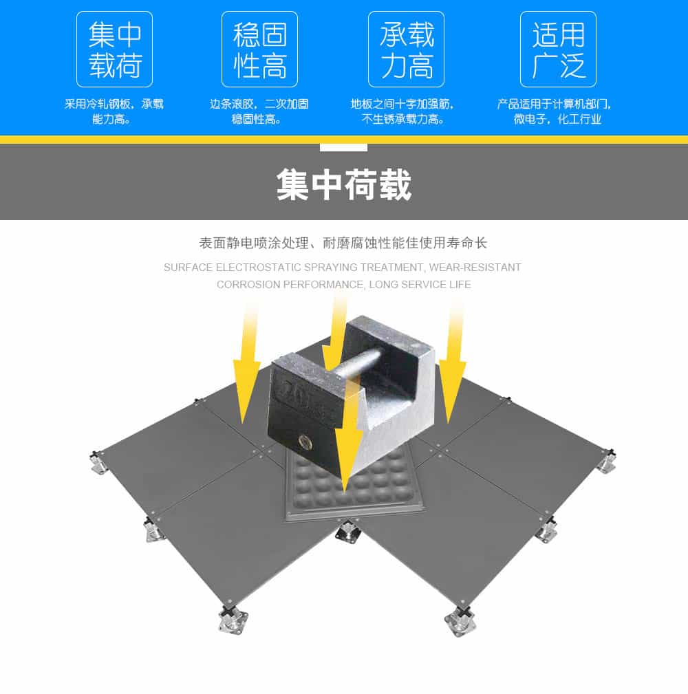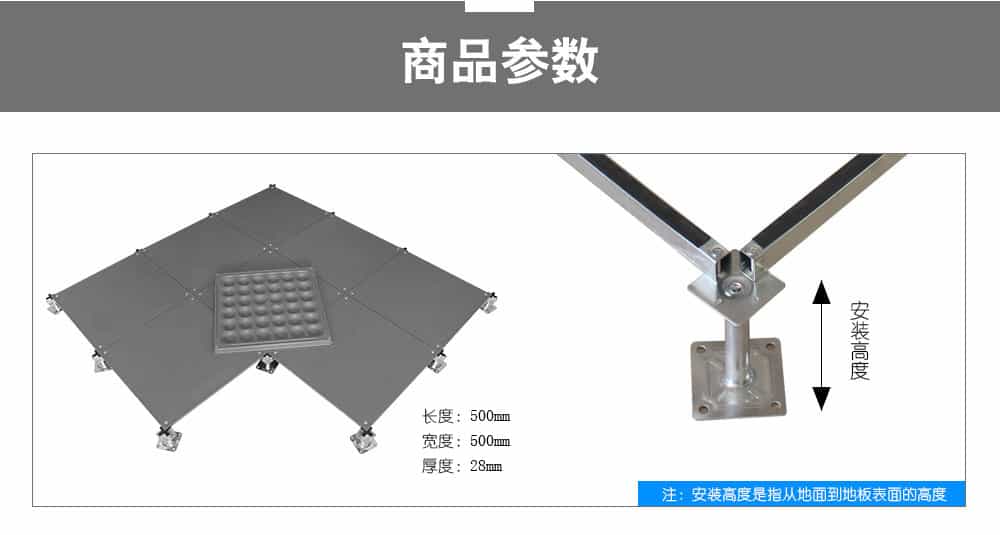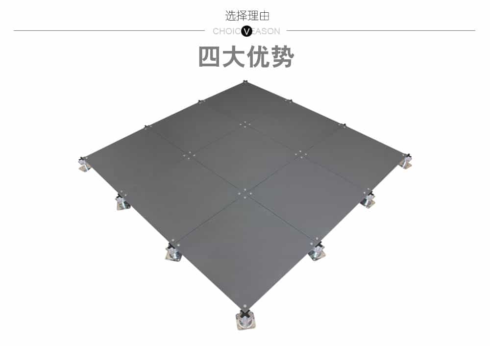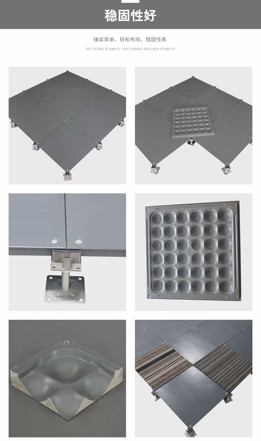 該地板可以選配帶出線口的配置,可根據要求任意添加線槽布線更具靈活性。此地板可以將強、弱電分開隔離,同時也便于檢修。安裝采用無梁角鎖,具有牢靠、穩定、調平、簡便之特點。